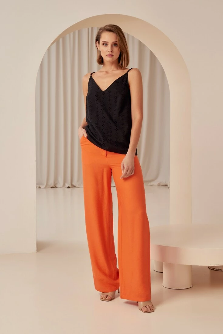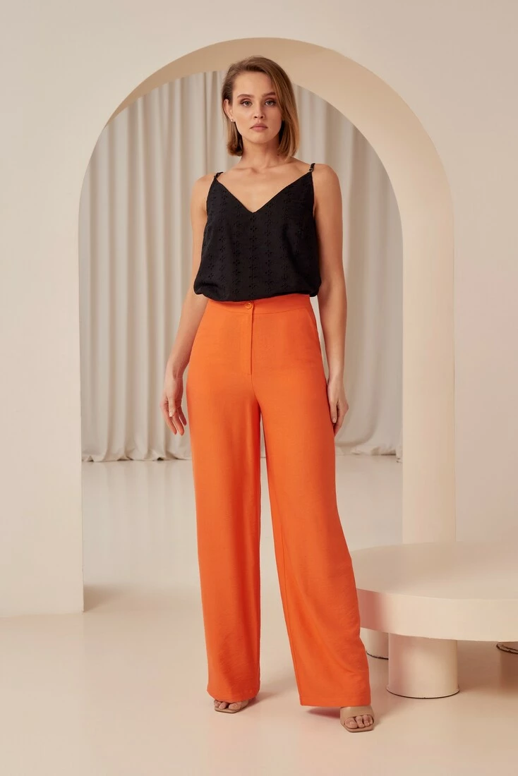 Ці прямі штани з еко-льону помаранчевого кольору не тільки мають привабливий вигляд, а й сприяють збереженню довкілля. Помаранчевий колір надає їм яскравості та динамічності, а прямий крій підкреслює стрункість і грацію фігури. Ці штани ідеально поєднуються з різними елементами гардероба, від блузок до топів. Забезпечують комфорт і свободу рухів, що робить їх ідеальним вибором для повсякдення. Крім того, еко-льон — матеріал, який дихає і не викликає алергії, що робить ці штани ще привабливішими для тих, хто дбає про своє здоров'я і комфорт. У цих штанах матимете стильний і впевнений вигляд у будь-якій ситуації.