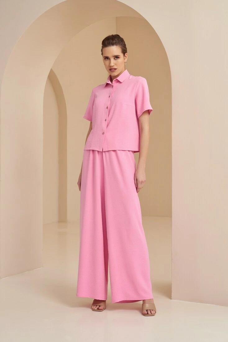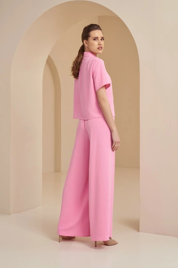 Цей костюм у рожевому кольорі — справжня знахідка для модниць, які шукають стильний і зручний одяг. Складається з блузи з коротким рукавом і штанів з віскозної тканини з жаткою, що надає їм текстури та об'єму. Блуза має короткий рукав, що робить її ідеальною для літнього сезону. Її ніжний рожевий колір підкреслює жіночність і створює романтичну атмосферу. Крім того, блуза має застібку на ґудзики, що забезпечує комфортну посадку на фігурі. Штани забезпечують максимальний комфорт і свободу руху, завдяки прямому крою. Носіть цей комплект як разом, так і окремо — у будь-якому разі матимете розкішний вигляд.